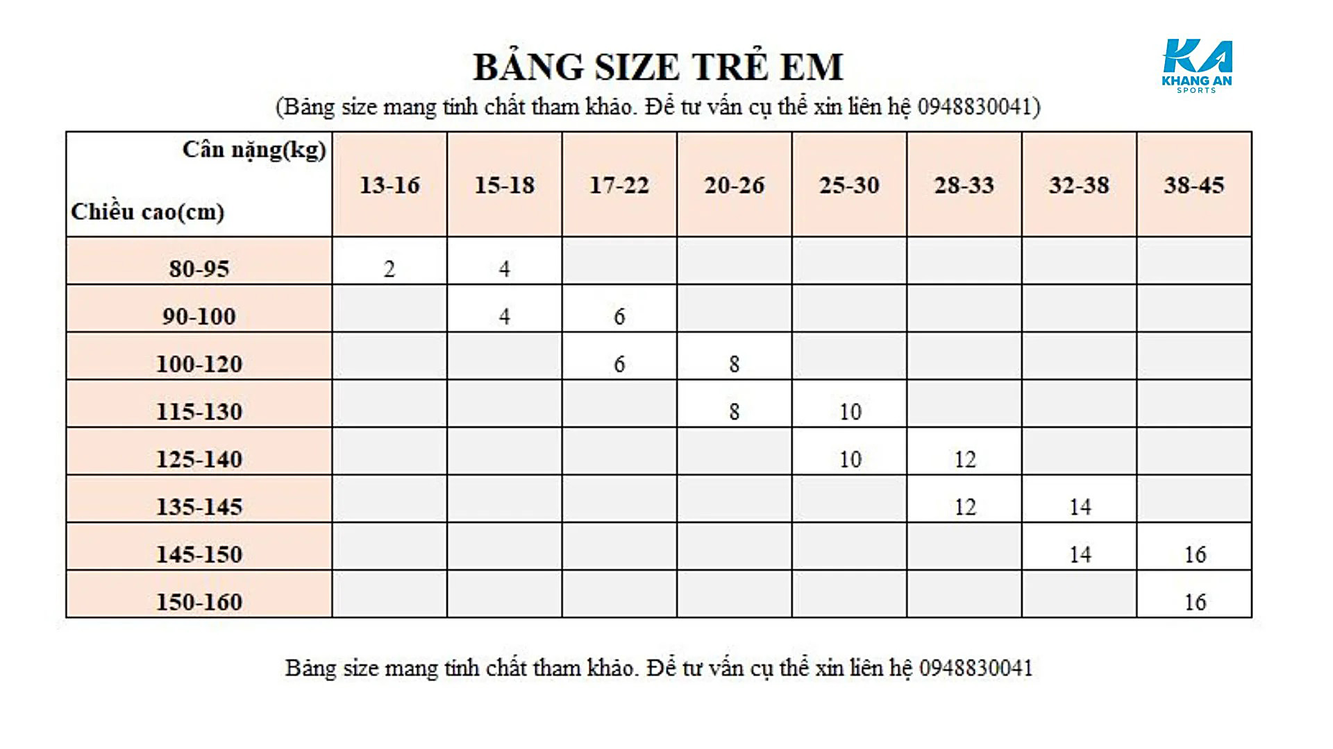 BẢNG SIZE CHO TRẺ EM: